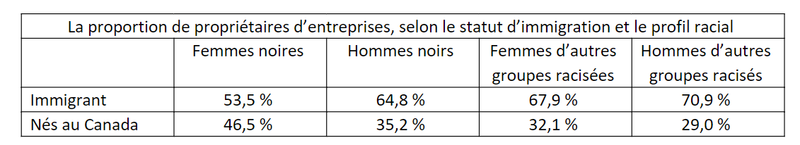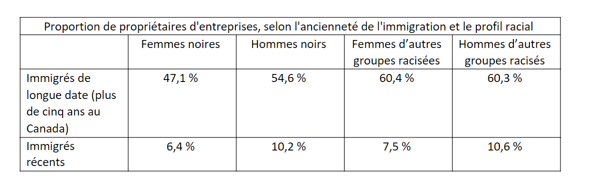 Supposons que nous excluons les Blancs, parce qu'il y a un très faible pourcentage d’immigrés blancs propriétaires d'entreprise. Dans ce cas, il est révélateur que les entrepreneuses immigrées noires soient le plus faible pourcentage de propriétaires d'entreprises récemment immigrés. Des recherches supplémentaires seraient nécessaires pour comprendre pourquoi le pourcentage de propriétaires d'entreprise récemment immigrés est légèrement plus élevé parmi les groupes racialisés.