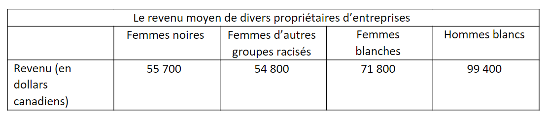 En moyenne, les femmes noires propriétaires d'entreprise gagnent 16 000 dollars de moins que les femmes blanches. Toutefois, les entrepreneuses noires gagnent à peu près la même chose que les hommes noirs et les autres femmes racialisées ; la différence de revenus moyens n'est pas statistiquement significative.