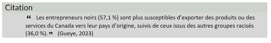 La perte pour l'ensemble de l'économie canadienne est particulièrement visible lorsque nous tenons compte du potentiel des entrepreneuses noires en tant qu'exportateurs. Gueye (2023) a constaté que les entrepreneurs immigrés noirs étaient motivés à exporter.
