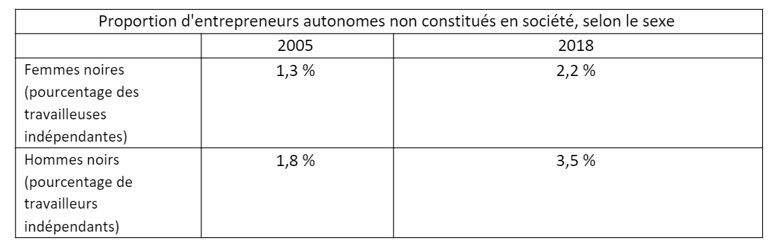 En général, le pourcentage d'entrepreneurs noirs a augmenté au fil du temps ; cependant, pour les femmes noires, ce pourcentage a progressivement augmenté de 0,9 % en treize ans. En revanche, le pourcentage d'hommes noirs qui sont indépendants ou propriétaires d'une entreprise non constituée en société a presque doublé entre 2005 et 2018. En 2018, 3,5 % de tous les travailleurs (masculins) indépendants sont des hommes noirs.