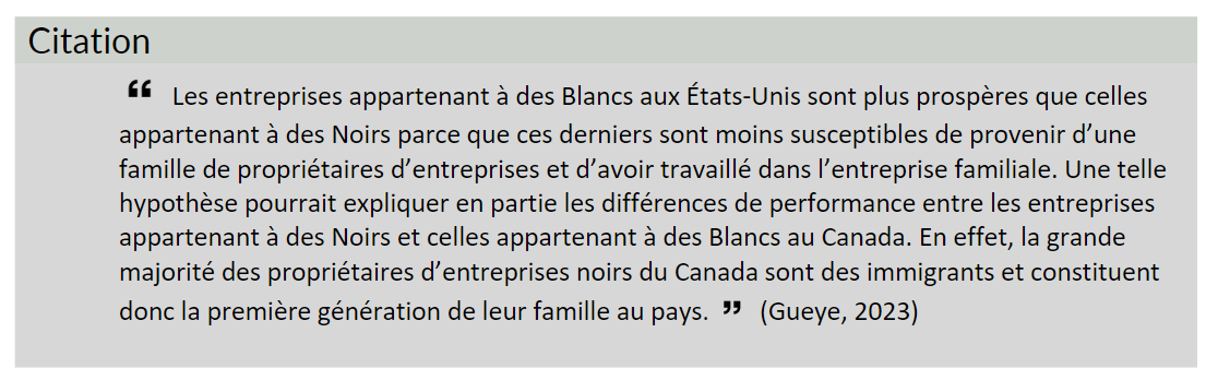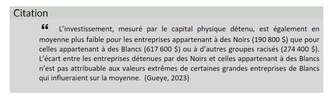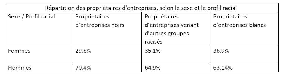 Performances financières : Les entreprises appartenant à des Noirs ne sont pas aussi performantes que les autres. Il existe des disparités au niveau des revenus moyens, des bénéfices et des investissements. Par exemple, le revenu moyen d'une entreprise appartenant à des Noirs est de 460 300 dollars, contre 1,2 million de dollars pour une entreprise appartenant à des Blancs et 645 300 dollars pour une entreprise appartenant à d'autres groupes racialisés (Gueye, 2023).