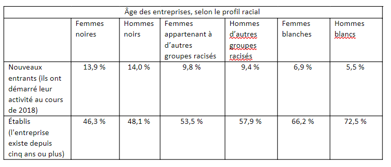 Les femmes noires sont en moyenne plus jeunes que leurs homologues blanches. Par exemple, l'âge moyen des femmes noires, des hommes noirs et des autres entrepreneurs racialisés (hommes et femmes) est de 47 ans. En revanche, l'âge moyen des entrepreneurs blancs (hommes et femmes) est de 53 ans.