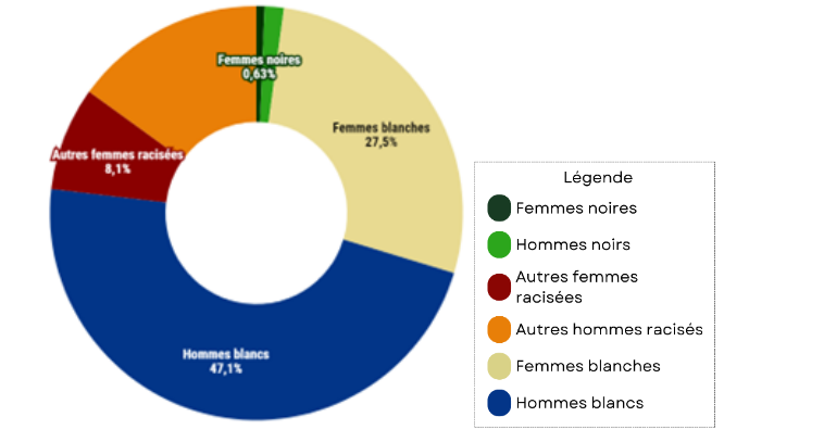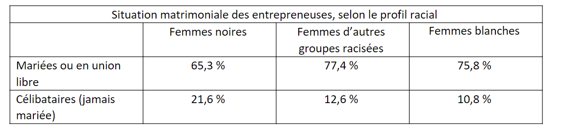 La plupart des chefs d'entreprise sont mariés ou vivent en union libre, ce qui est également le cas des entrepreneuses noires (65,3 %). Néanmoins, la proportion de femmes noires célibataires est également plus élevée (21,6 %) (Gueye, 2023). Ce n'est toutefois pas le cas pour les autres femmes racialisées ou les femmes blanches.