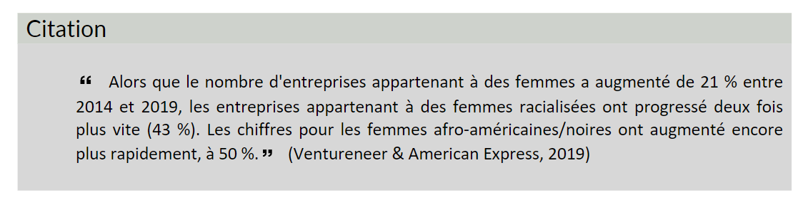 Ventureneer & American Express. (2019). Le rapport 2019 sur l’état des entreprises détenues par des femmes. Dans Ventureneer. Consulté le 29 mars 2023, à l’adresse https://ventureneer.com/wp-content/uploads/2019/10/Final-2019-state-of-women-owned-businesses-report.pdf